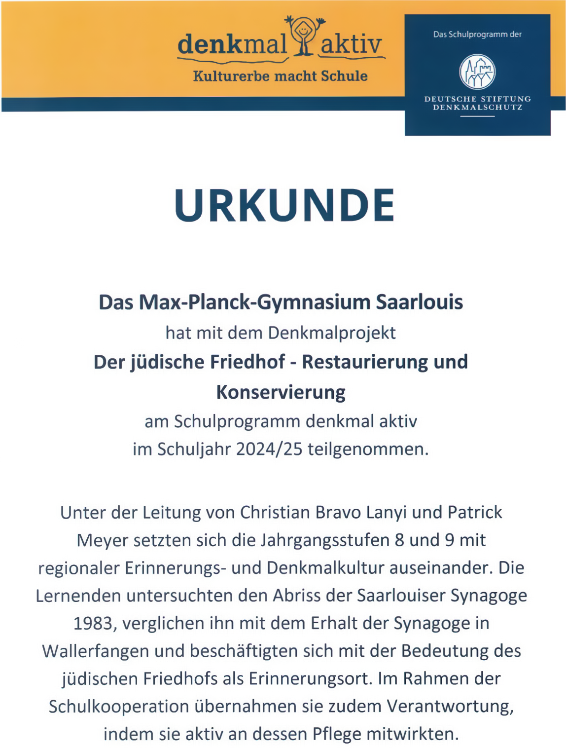 Am Montag, den 21.11.2022, wurde das Max-Planck-Gymnasium Saarlouis zusammen mit 17 weiteren saarländichen Schulen von Abteilungsleiterin Nicole Cayrol (Bildungsministerium) und Harald Fisch (Geschäftsführer und Vorstand von “MINT Zukunft schaffen!") erneut als „MINT-freundliche Schule“ ausgezeichnet. Die Auszeichnungen sind drei Jahre gültig.