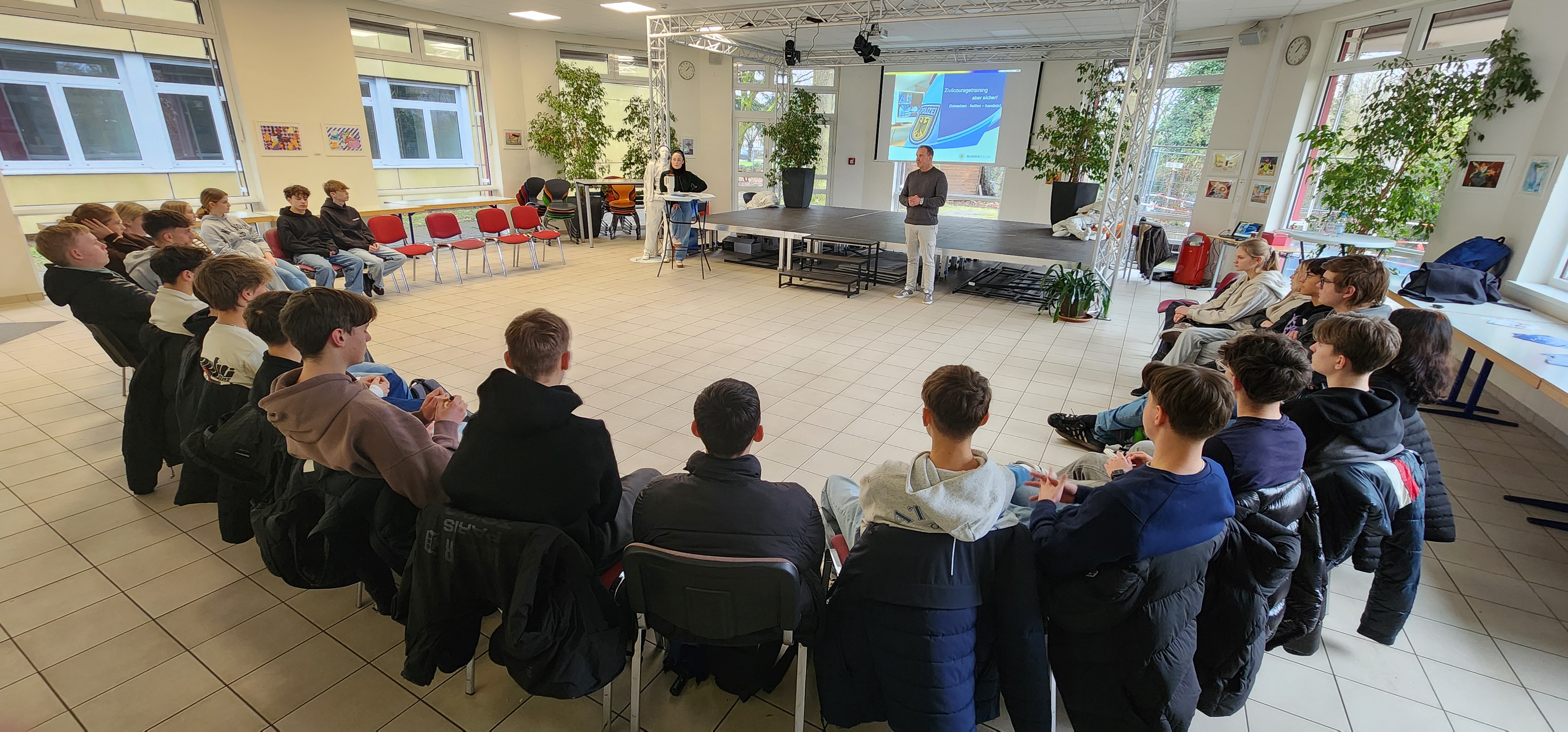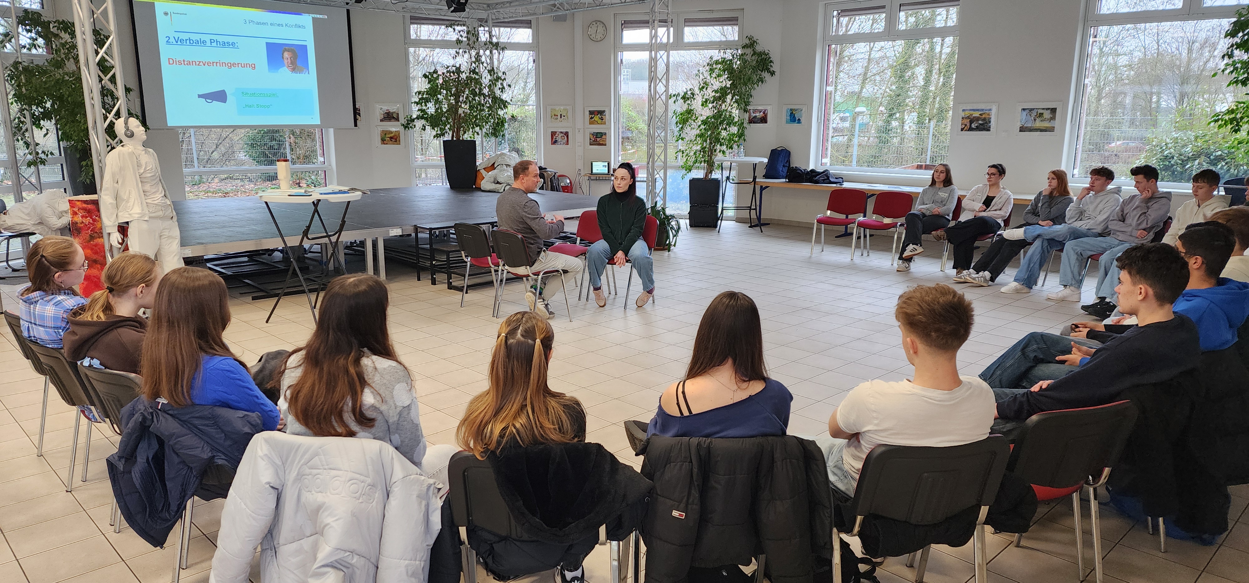 Nach der Großveranstaltung am 1. Februar für vier Gymnasien im Theater am Ring, in der die Zehntklässler*innen den Zeitzeugenbericht von Henri Juda über die Shoah gehört haben, und sie im Anschluss Mo Asumang darüber aufkärte, was „Arier“ sind oder vermeintlich sein sollten und dass dieses Konzept ein reines Hirngespinst war und ist, um die Gesellschaft zu spalten, fragten wir uns, wie man mit menschenverachtenden und rassistischen Äußerungen im Alltag umgehen kann. Mo Asumang stand selbst Modell für die Möglichkeit, wie man Zivilcourage zeigen kann.
